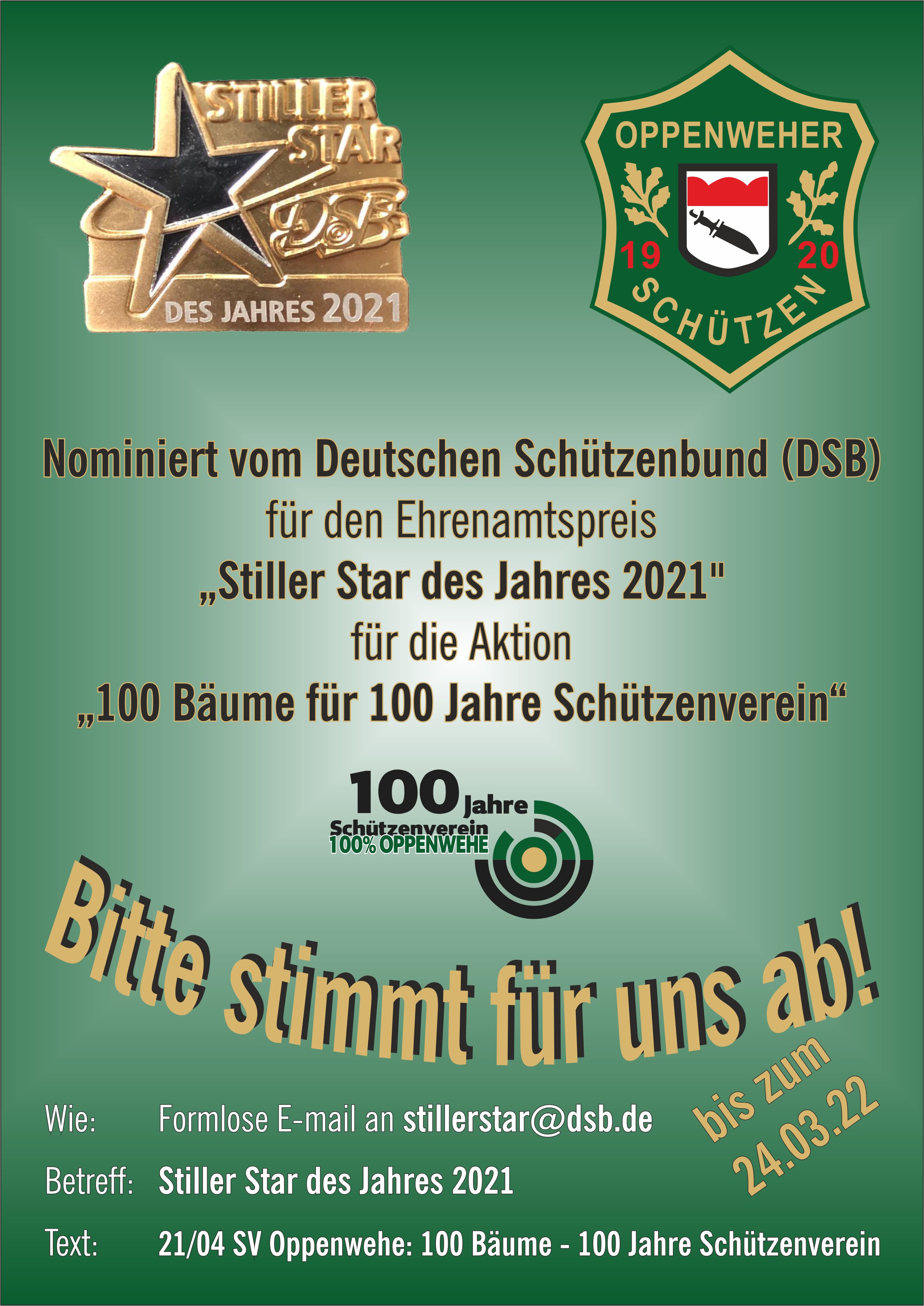 Bereits im April 2021 sind wir vom Deutschen Schützenbund für unsere Aktion Schützenwald vollkommen unerwartet und unangekündigt zum Stillen Star für den Monat April ausgezeichnet worden. Dies erfolgte direkt vom DSB, welcher 12x im Jahr einen Stillen Star kührt. Nun findet unter allen 12 Gewinnern die Auswahl des Stillen "Jahres" Stars 2021 statt. Dies erfolgt nicht mehr intern im DSB sondern kann jeder an der Wahl seine Stimme abgeben. Der Stille Star der bis zum 24. März die meisten Stimmen erhält gewinnt den Jahrespreis.