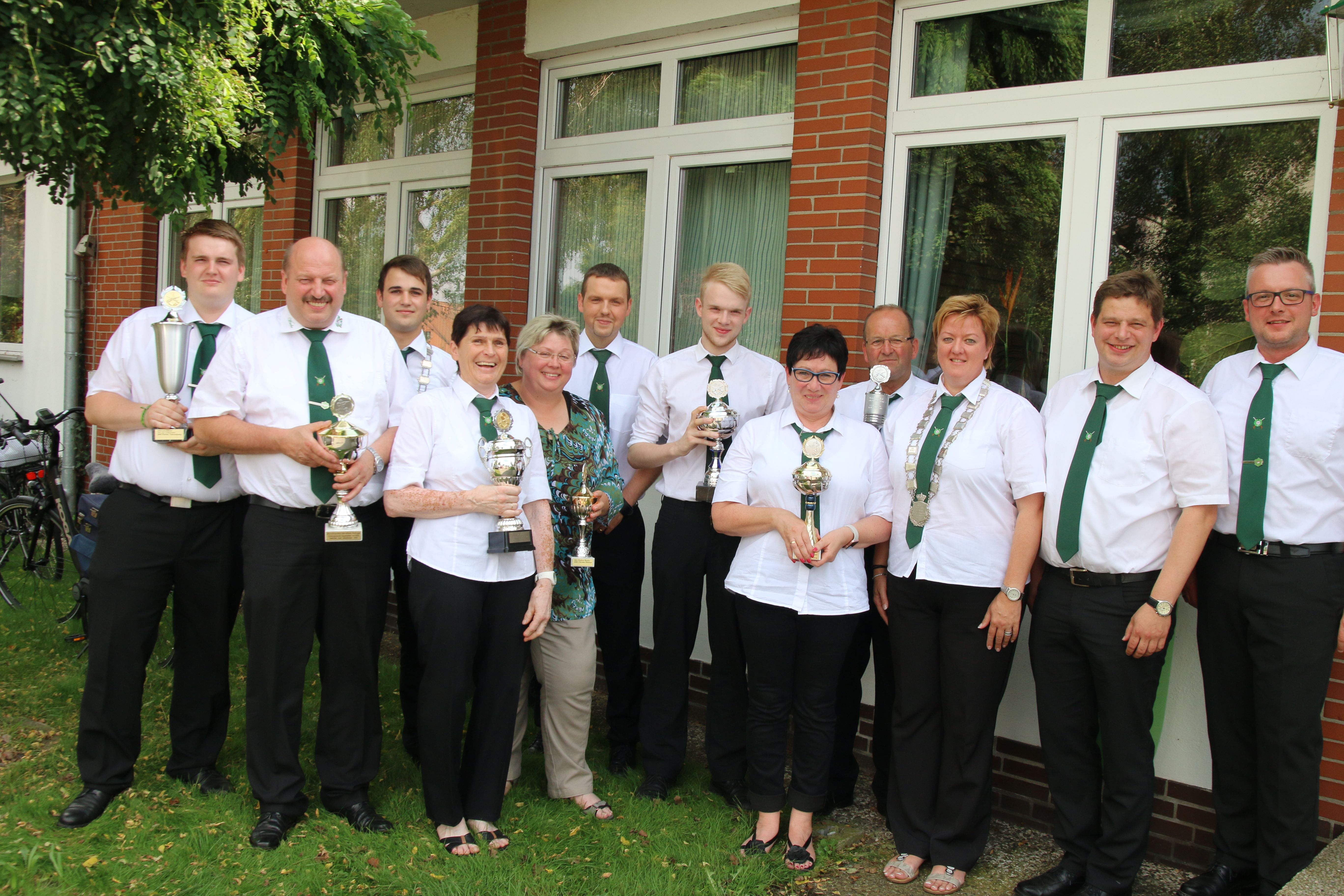 Stemwede/Oppenwehe........bo. Mit Spannung wurde am Sonntag beim „heißen“ Königs- und Adjutanten-Pokalschießen des Oppenweher Schützenvereins die Ergebnisbekanntgabe durch den Vorsitzenden Matthias Spreen erwartet. Seine besonderen Grüße galten den amtierenden Majestäten Manuela Schlömp und Chris Rehburg mit ihrem jeweiligen Hofstaat und dem Ehrenvorsitzenden Friedhelm Bohne. Zum 10. Mal wurde auch das Schießen um einen „Er und Sie-Pokal“ angeboten, den nach einer Gemeinschaftsleistung Marianne und Günter Sprado gewinnen konnten und somit den Wanderpokal für ein Jahr ihr Eigen nennen dürfen. Sie erzielten zusammen 82,5 Ringe. Der ehemalige Altkönig und noch amtierende Kreiskönig Günter Sprado kann sich mit einem Ergebnis von 30,3 Ringen, für ein Jahr als König der ehemaligen Altkönige bezeichnen und den Wanderpokal mit seinem Namen beschriften lassen. Ihm folgten auf Rang zwei die amtierende Königin Manuela Schlömp mit 29,5 Ringen und auf Patz drei Friedhelm Bohne mit 29,3 Ringen. Bei den Adjutanten der ehemaligen Altkönige siegte Jürgen Klamor mit 26,1 Ringe. Bei den ehemaligen Jungkönigen setzte sich Pascal Meyrose mit 31,5 Ringen durch. Ihm folgte auf Rang zwei mit 30,2 Ringen, Sven Bollhorst. Gleich drei weitere ehemalige Jungkönige konnten dieses Ergebnis erzielen. Mathias Heitmann, Jürgen Kröger und Michel Schäffer teilten sich mit Sven Bollhorst den 2. Platz. In der Klasse der ehemaligen Jungadjutanten siegte Henrik Heselmeier mit 30,4 Ringen. Den 2. Platz mit 51,9 Ringen Florian Vahrenkamp. Die ehemalige Adjutantin eines Oppenweher Hofstaates, Christa Klamor, konnte sich mit 52,2 Ringen auf Rang 1 platzieren. Den 2. Platz belegte Ann-Christin Mentrup mit 51,9 Ringen. Bei den ehemaligen Königinnen siegte Ingrid Bohne mit 52,5 Ringen vor Monika Eilmes mit 52,3 Ringen. Den 3. Platz belegte Marianne Sprado mit 52,2 Ringen. Einen besonderen Dank richtete der Vorsitzende an die Aufsicht und Auswertung, die von Jürgen Kröger, Michel Schäffer, Matthias Heitmann und Michael Holle vorgenommen wurde.